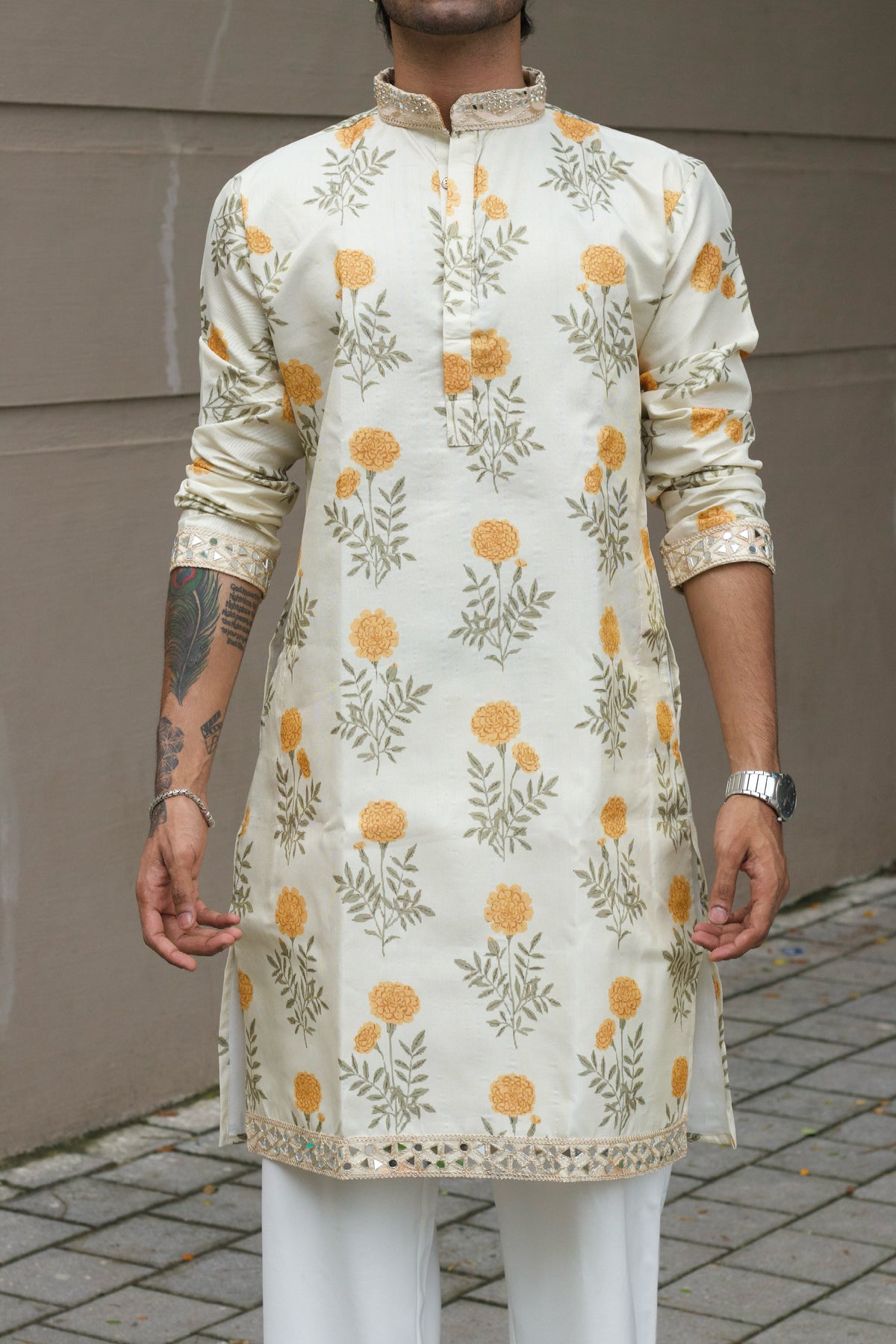 Exude elegance and festive charm with the Marigold Floral Printed Exclusive Kurta. A perfect blend of heritage aesthetics and contemporary tailoring, this piece is a must-have for the discerning Indian gentleman.