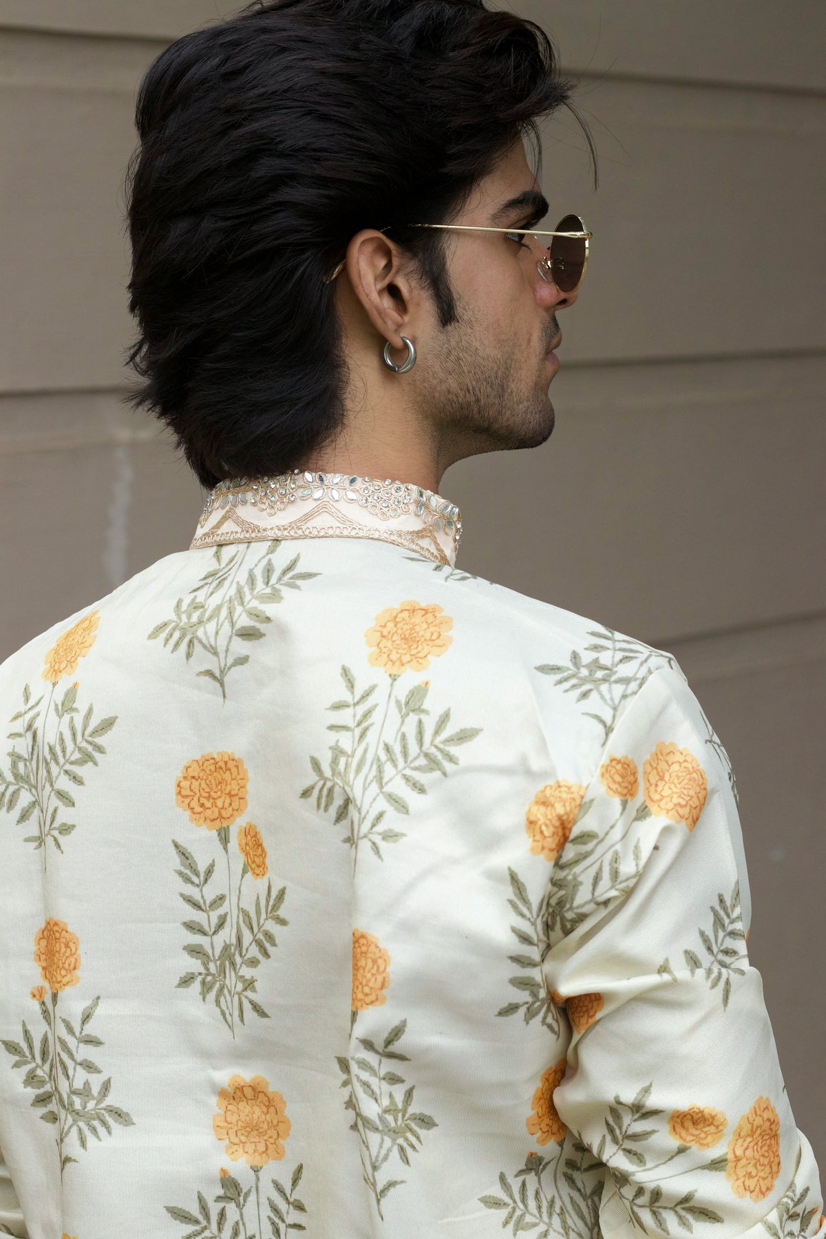 Centering on the Genda Phool (Marigold), a symbol of prosperity and new beginnings, this kurta is designed for life's most auspicious moments. The warm saffron tones of the marigold are artfully contrasted against a serene cream-colored base, creating a visual balance that is both striking and sophisticated.