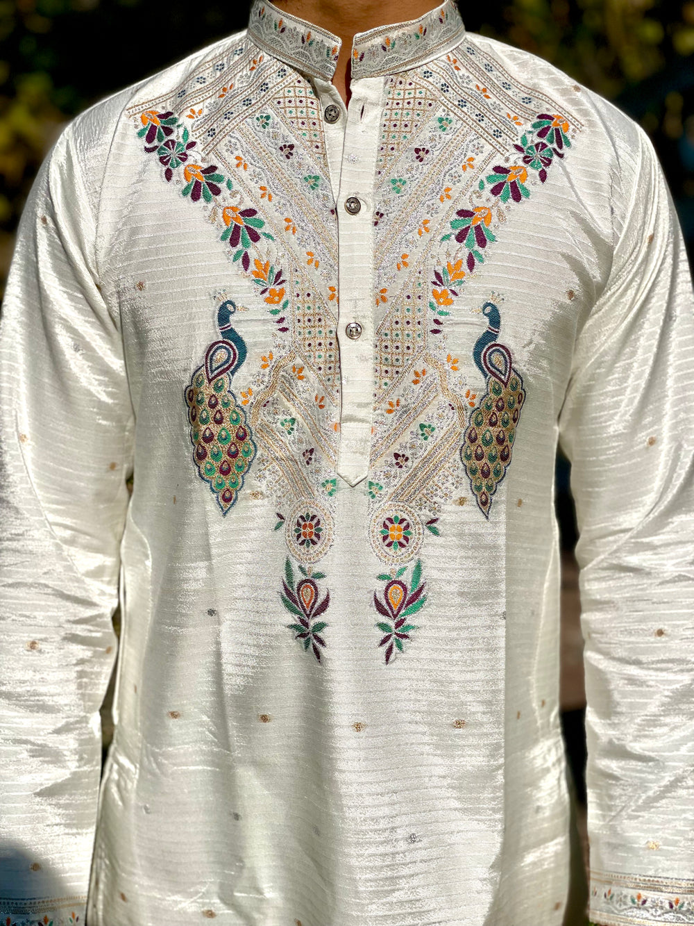Crafted entirely in intricate Jacquard work, this kurta is a testament to regal artistry and cultural richness. Each motif is wove not embroidery into the fabric using a detailed accurate technique that elevates the design with texture, depth, and elegance.