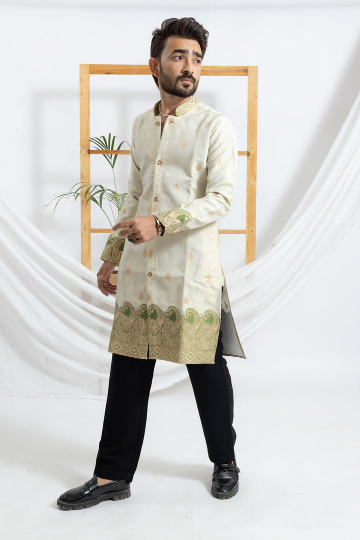 Elevate your festive and wedding wardrobe with this Ivory & Green Banarasi rajshahi keri Jacquard Kurta from SHRIIMANT, crafted for the modern man who values timeless elegance and intricate craftsmanship. Featuring luxurious paisley and floral motifs woven in golden zari, this kurta exudes royal sophistication. The rich red border adds a bold touch, making it a standout piece for any celebration.