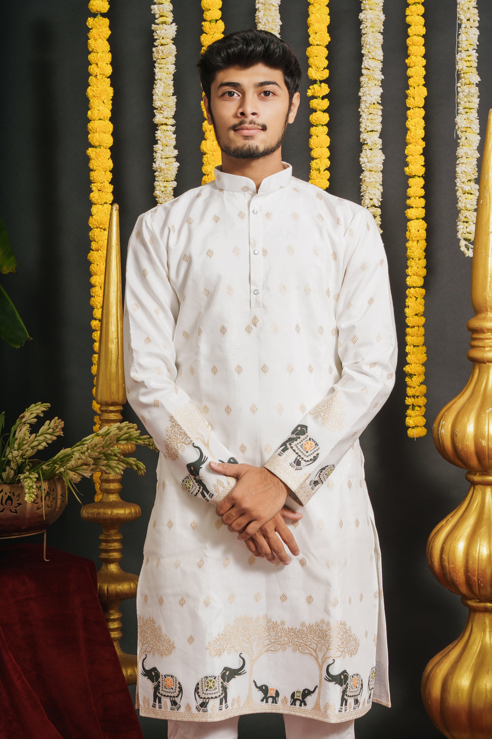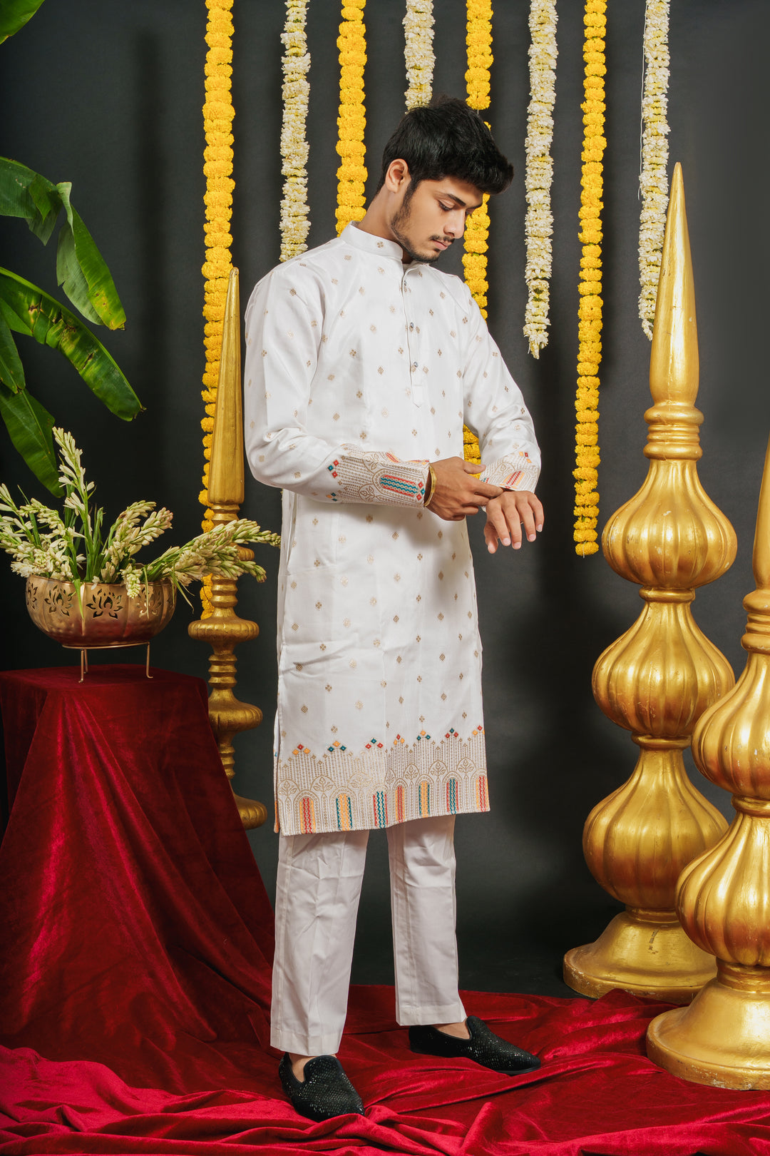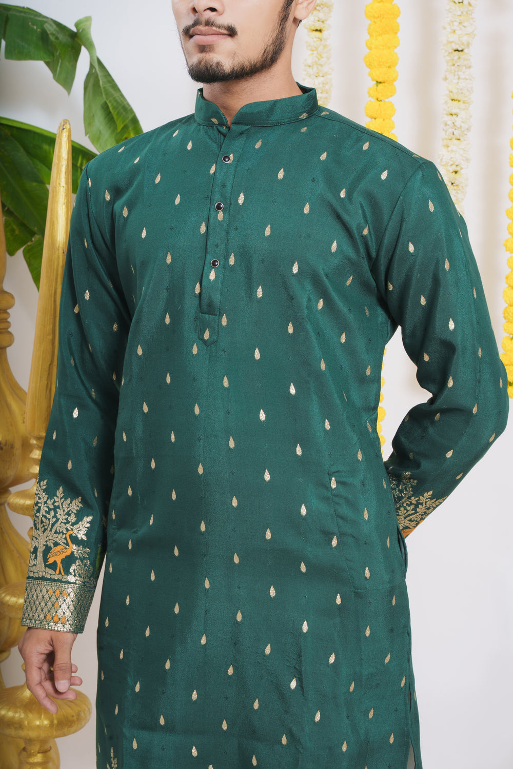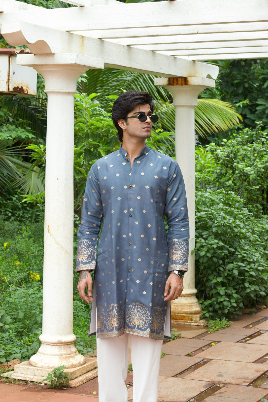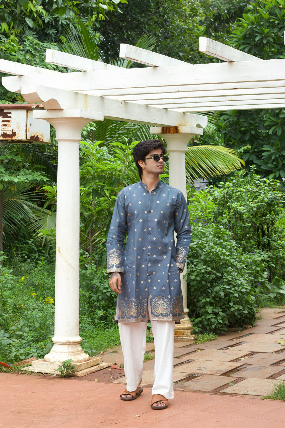 With a refined mandarin collar, minimalistic buttons, and shimmering woven patterns, this kurta is an ideal choice for festive occasions, weddings, or cultural celebrations. Designed for both style and comfort.