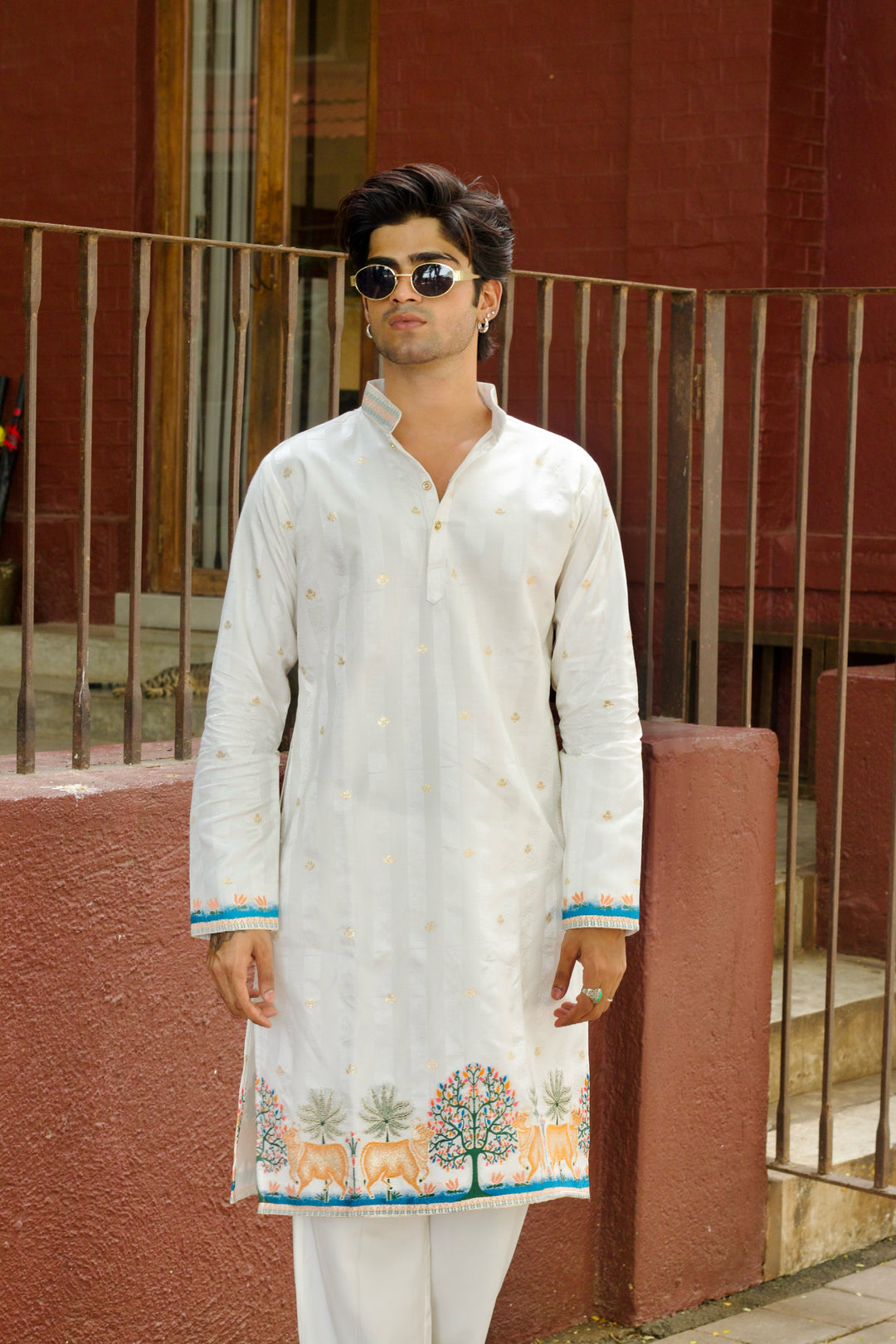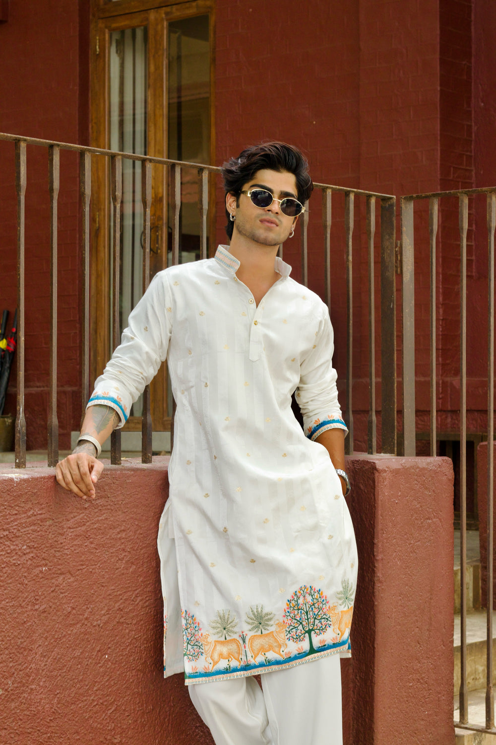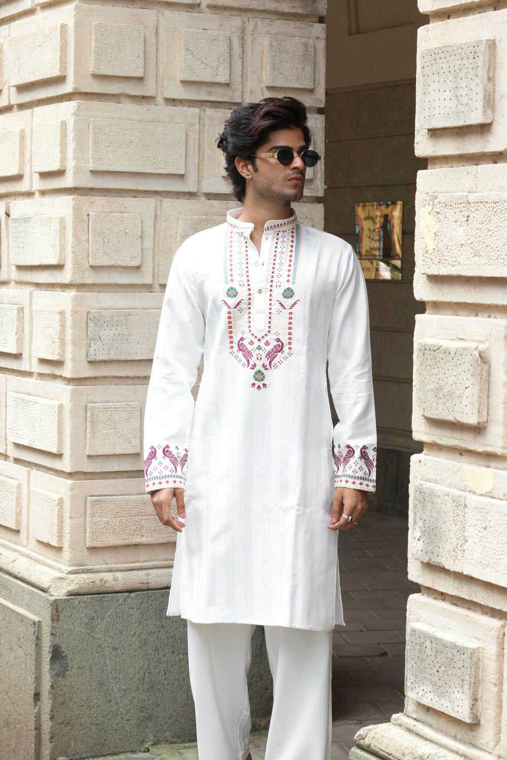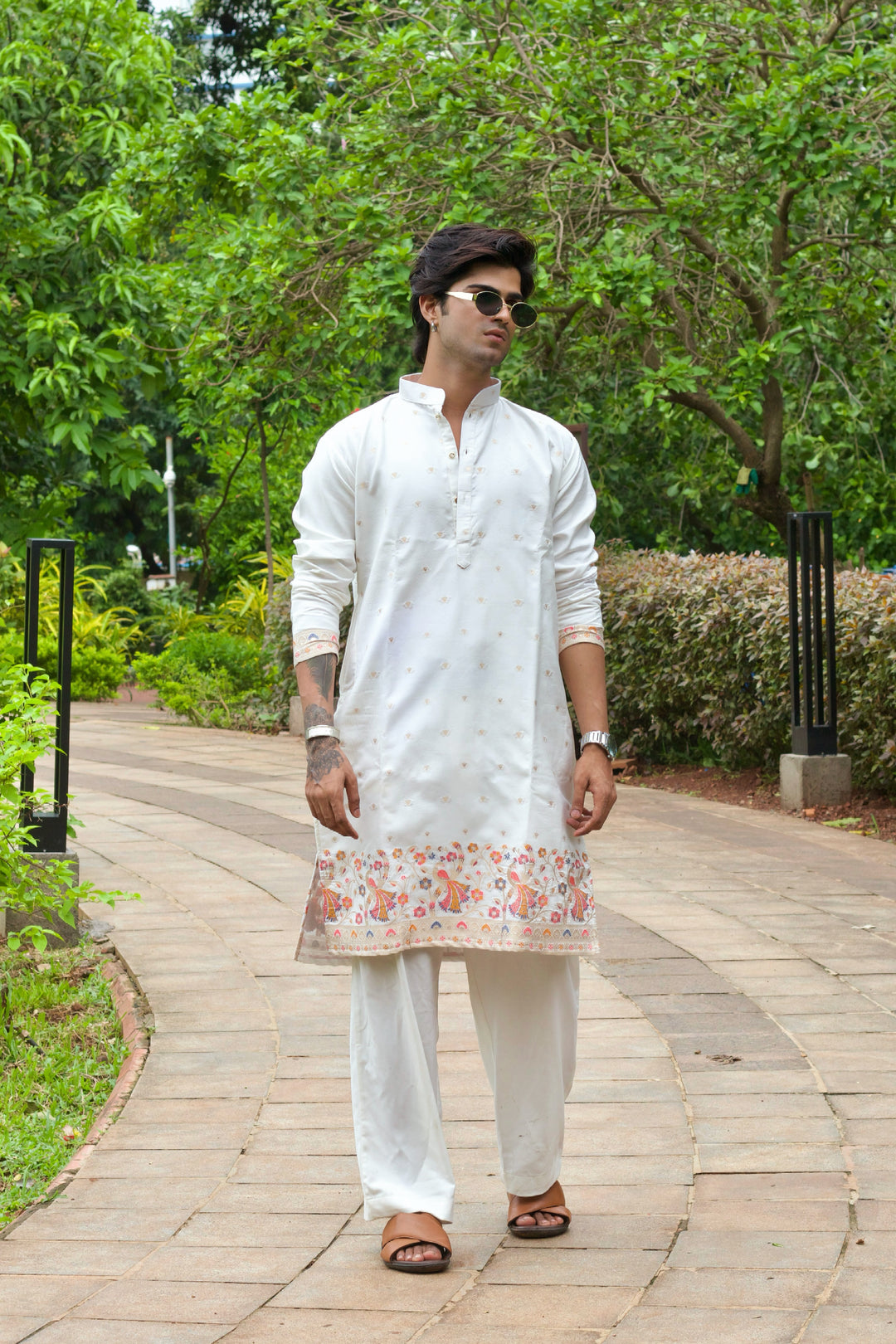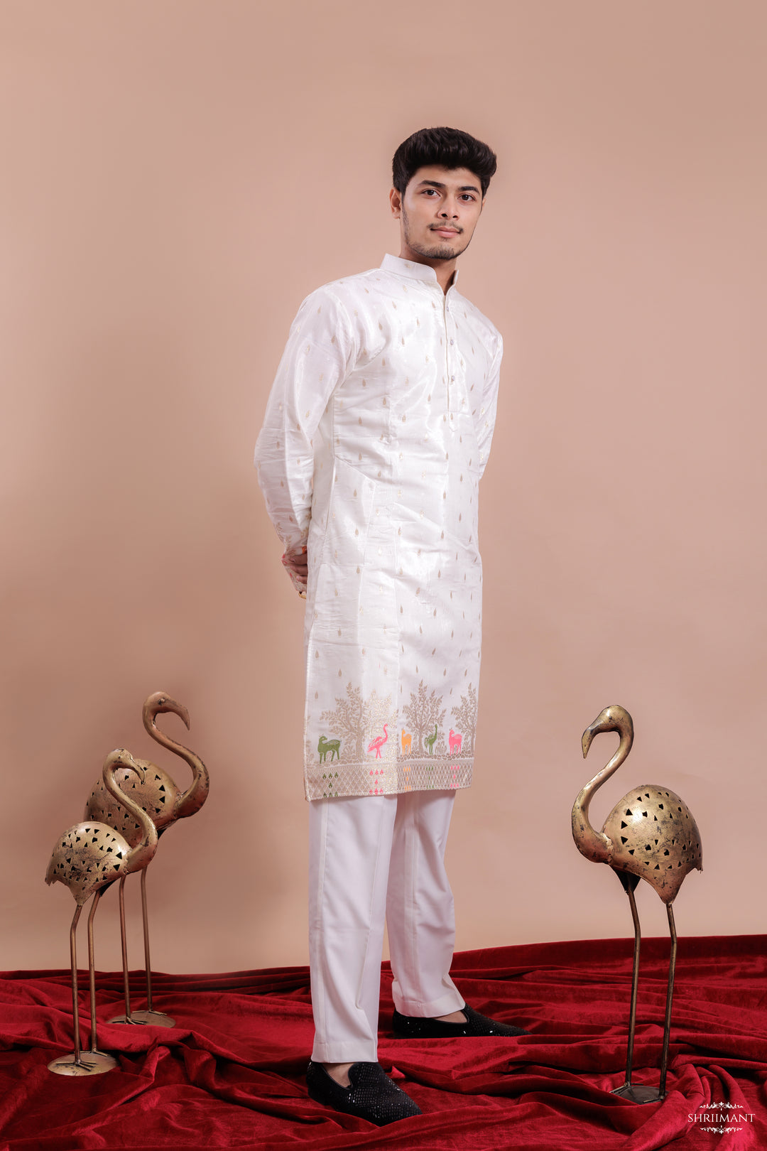 With a refined mandarin collar, minimalistic buttons, and shimmering woven patterns, this kurta is an ideal choice for festive occasions, weddings, or cultural celebrations. Designed for both style and comfort.