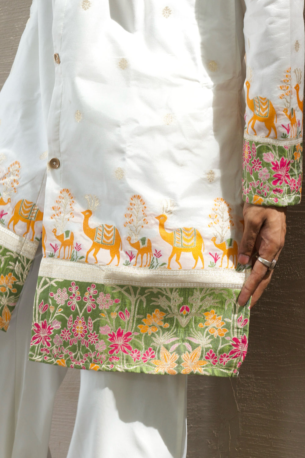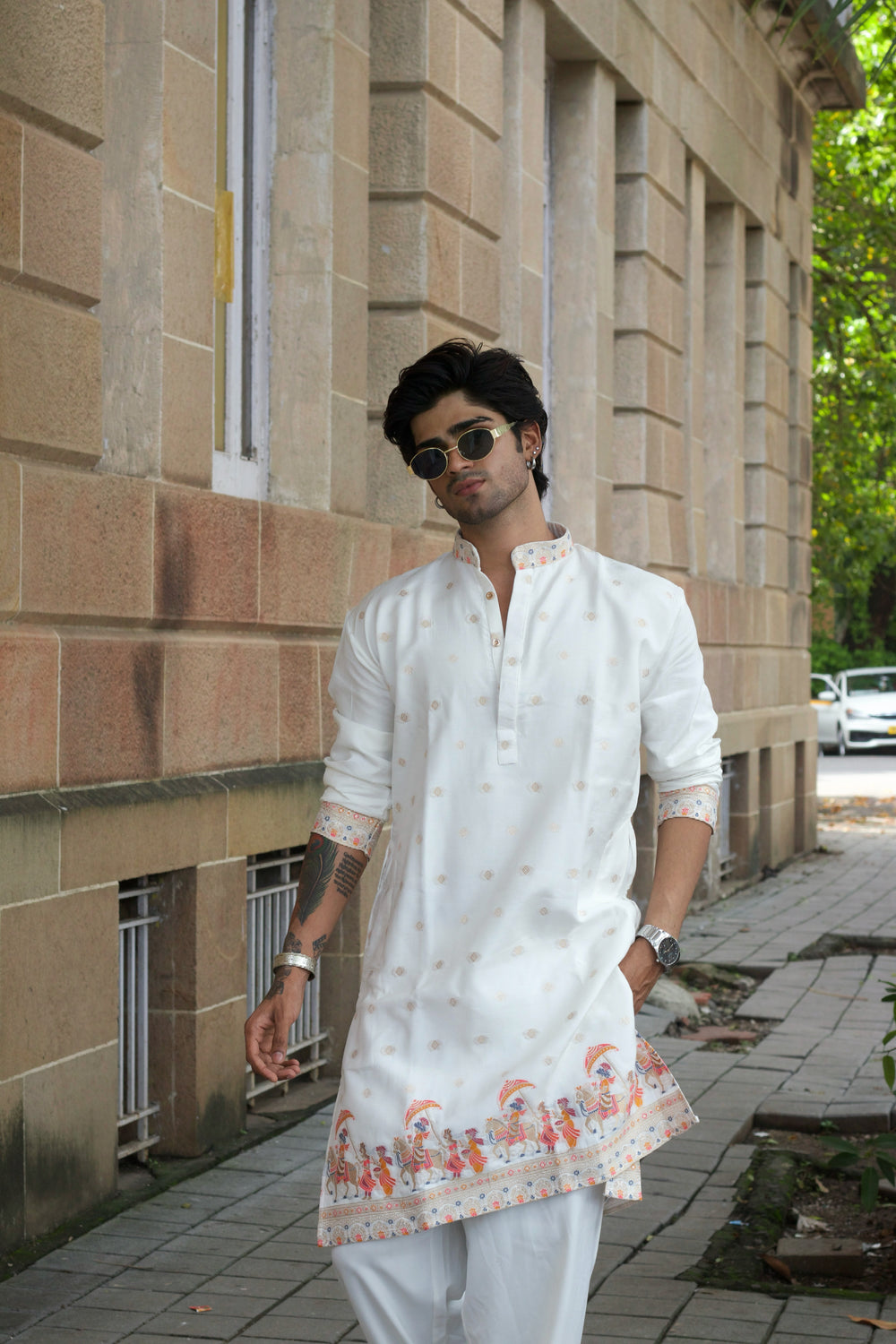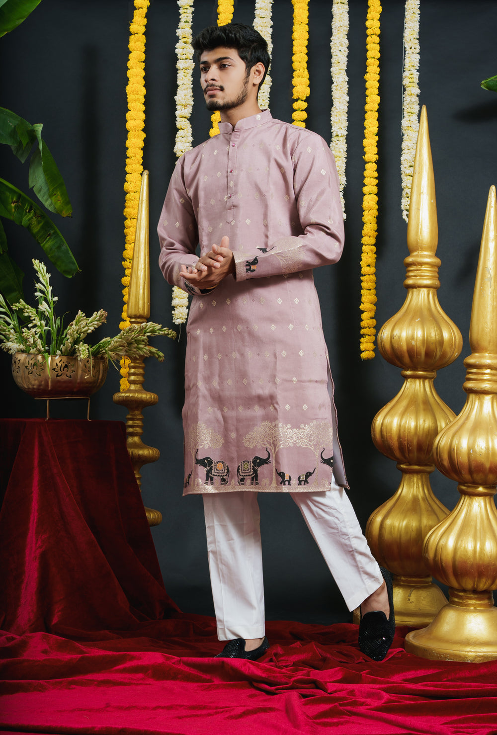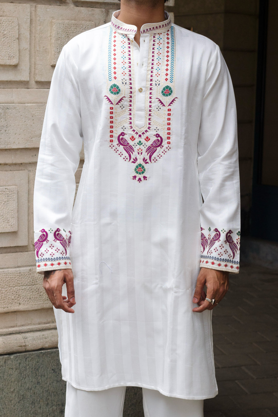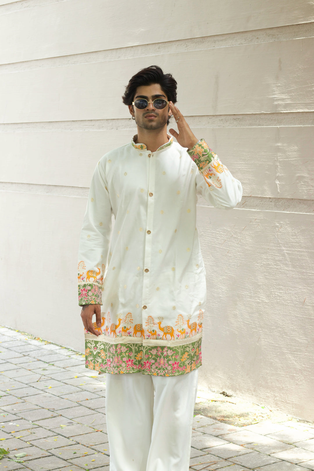 With a refined mandarin collar, minimalistic buttons, and shimmering woven patterns, this kurta is an ideal choice for festive occasions, weddings, or cultural celebrations. Designed for both style and comfort.