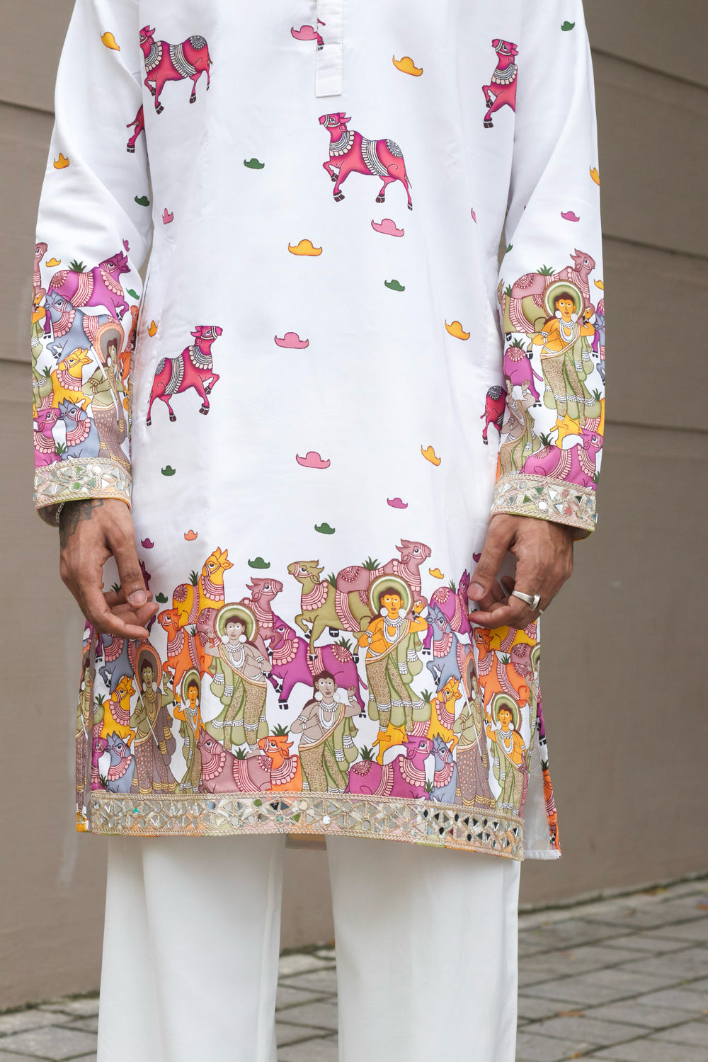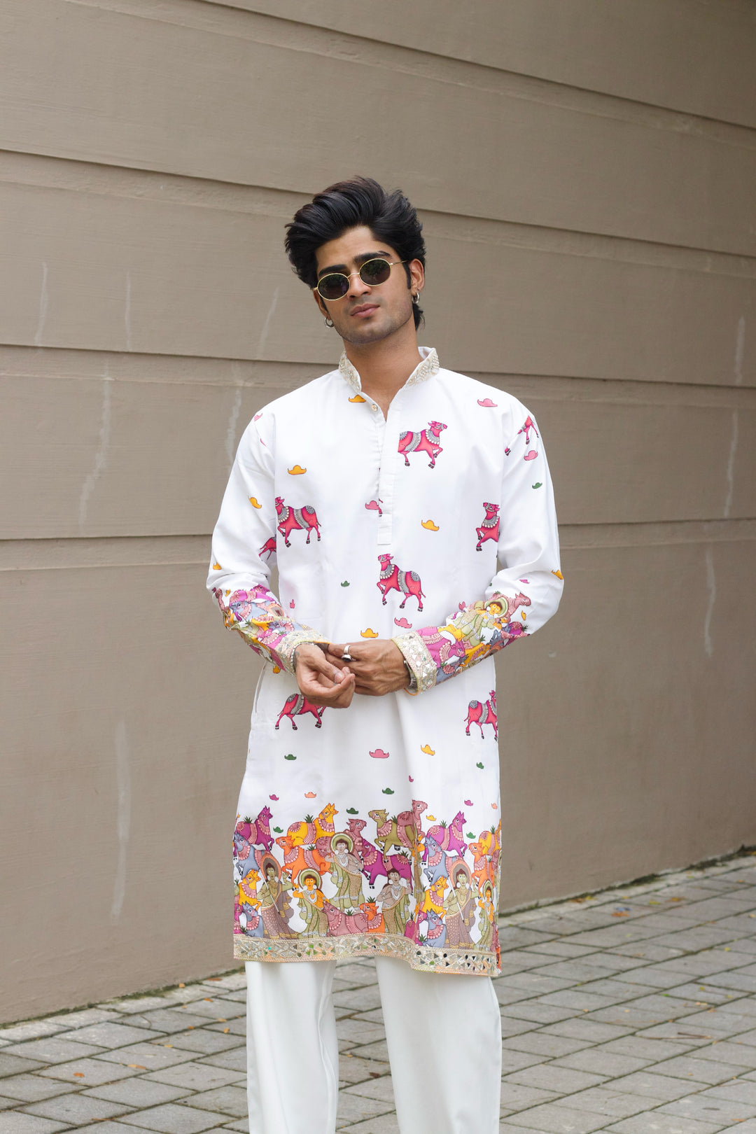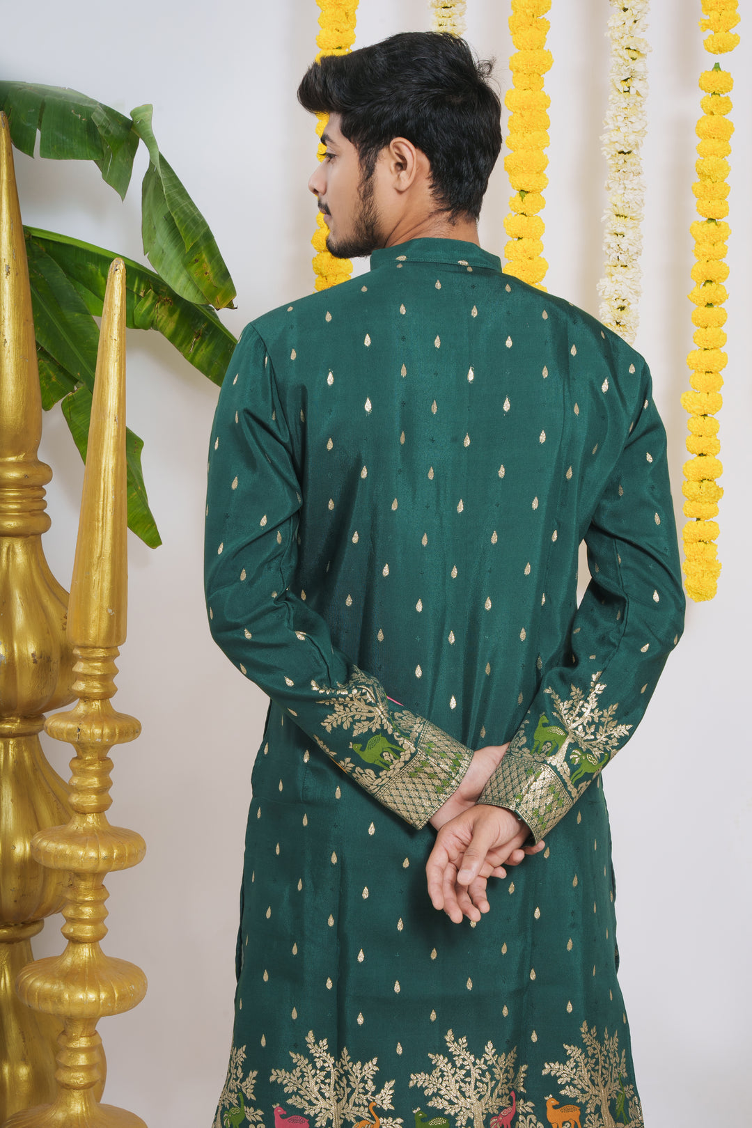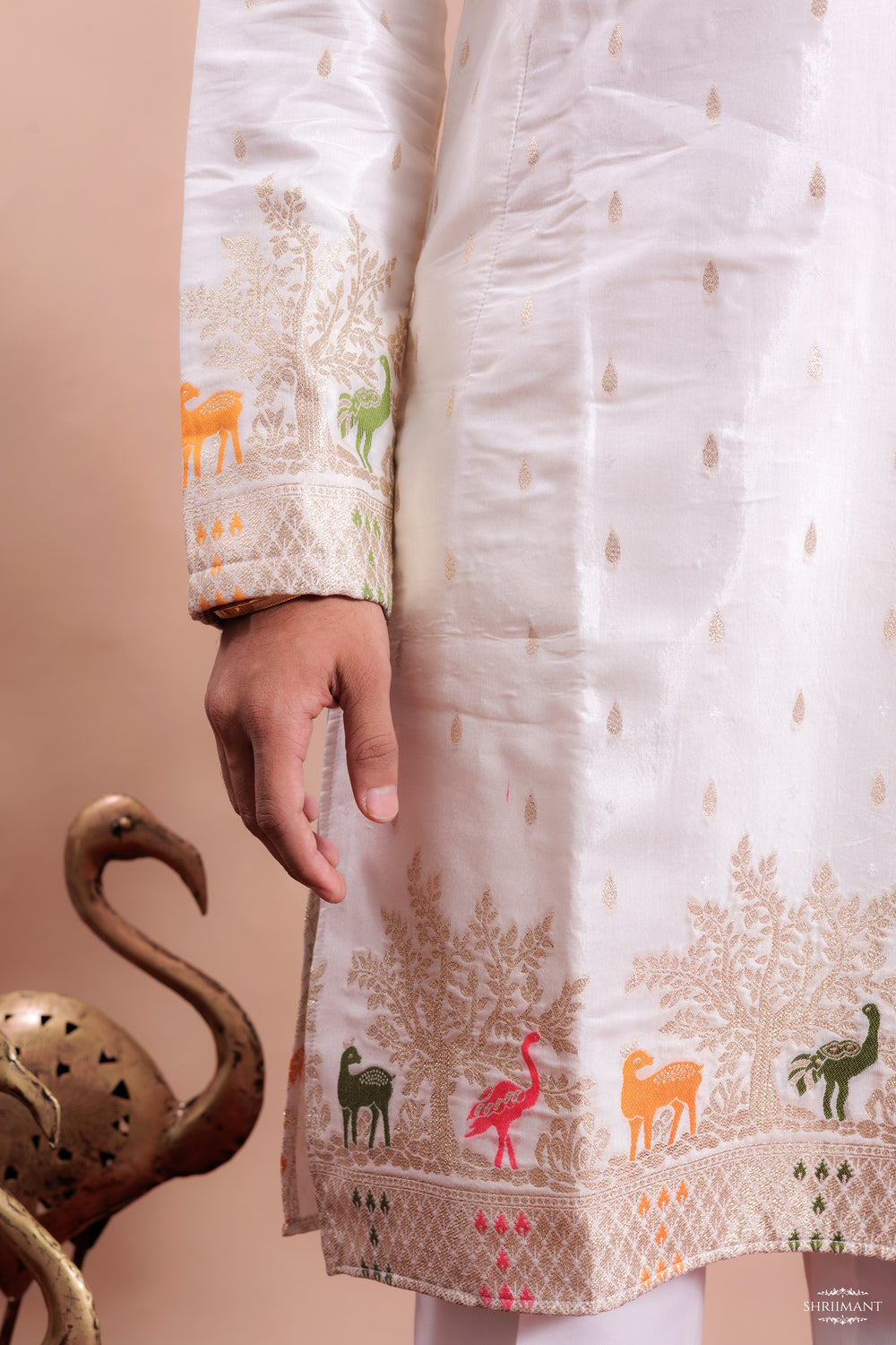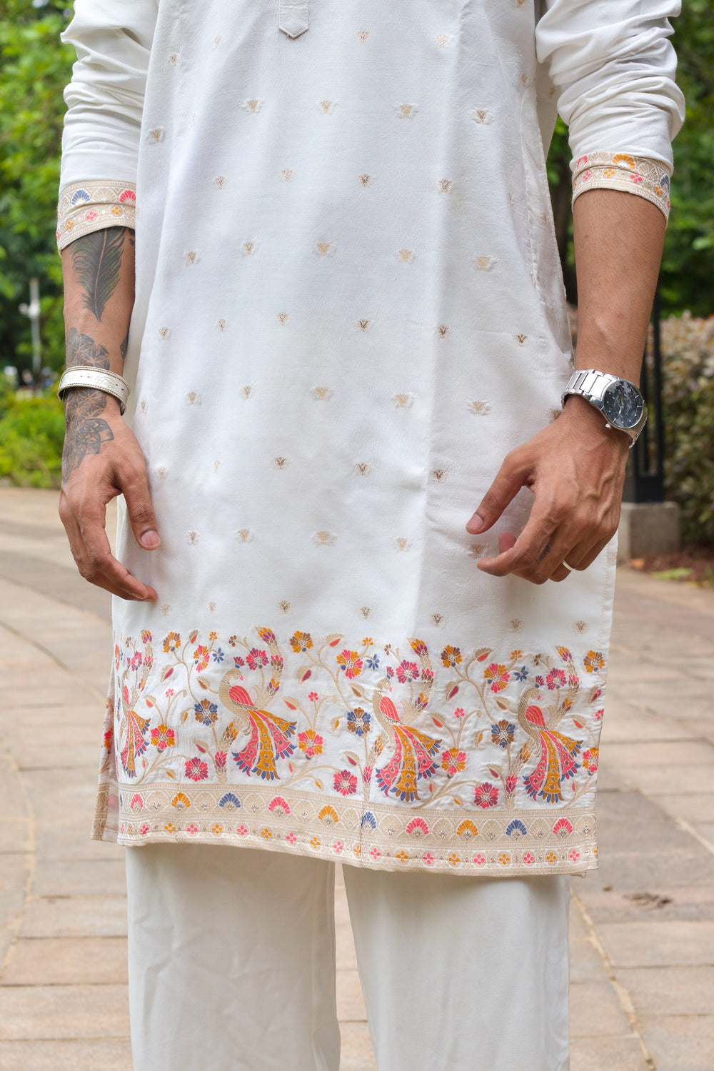 With a refined mandarin collar, minimalistic buttons, and shimmering woven patterns, this kurta is an ideal choice for festive occasions, weddings, or cultural celebrations. Designed for both style and comfort.