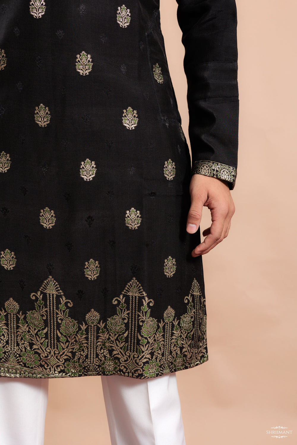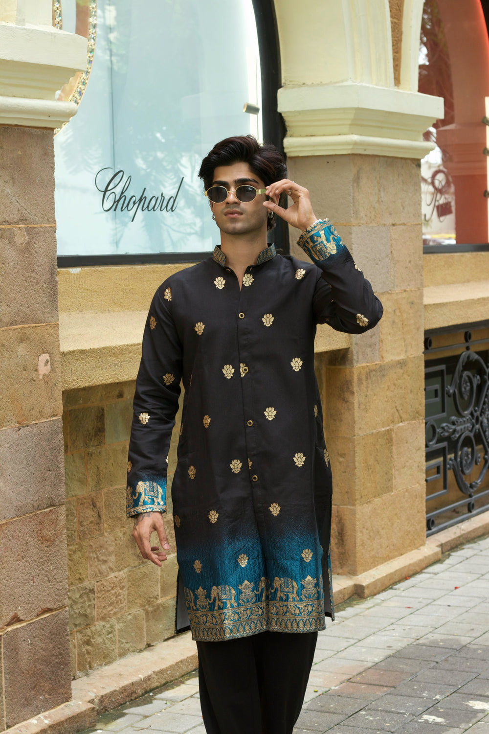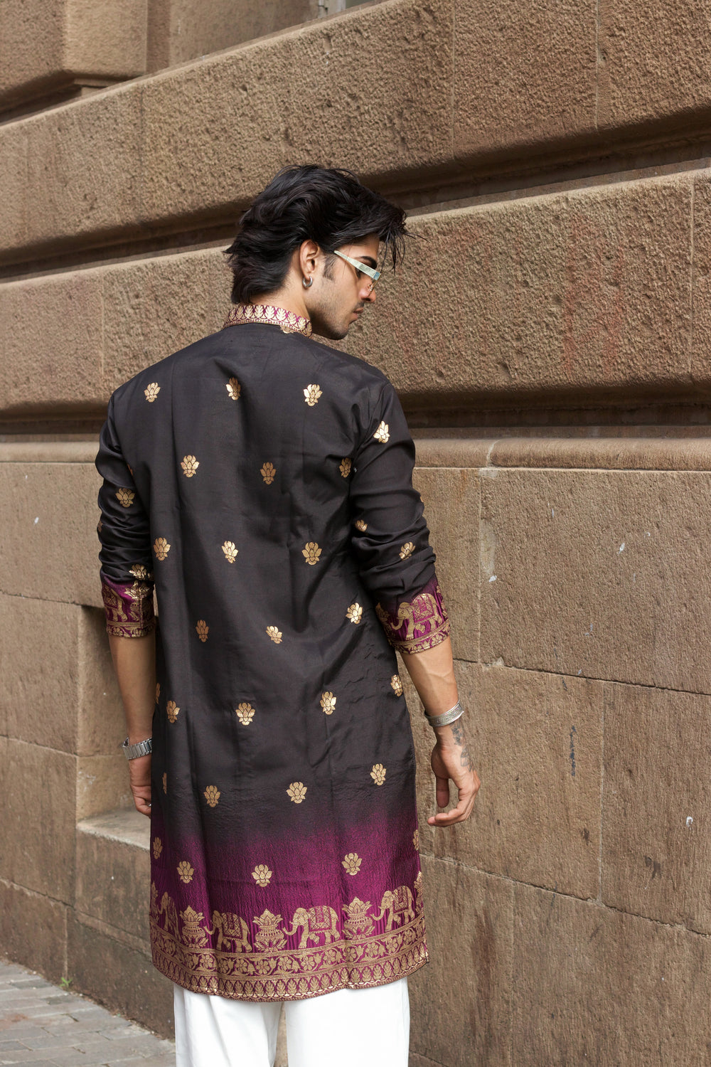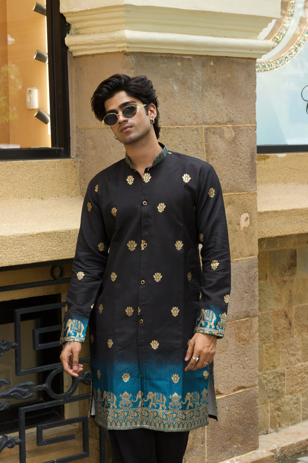 BLACK BANARASI BORDER JACQUARD DESIGNER INDO KURTA
