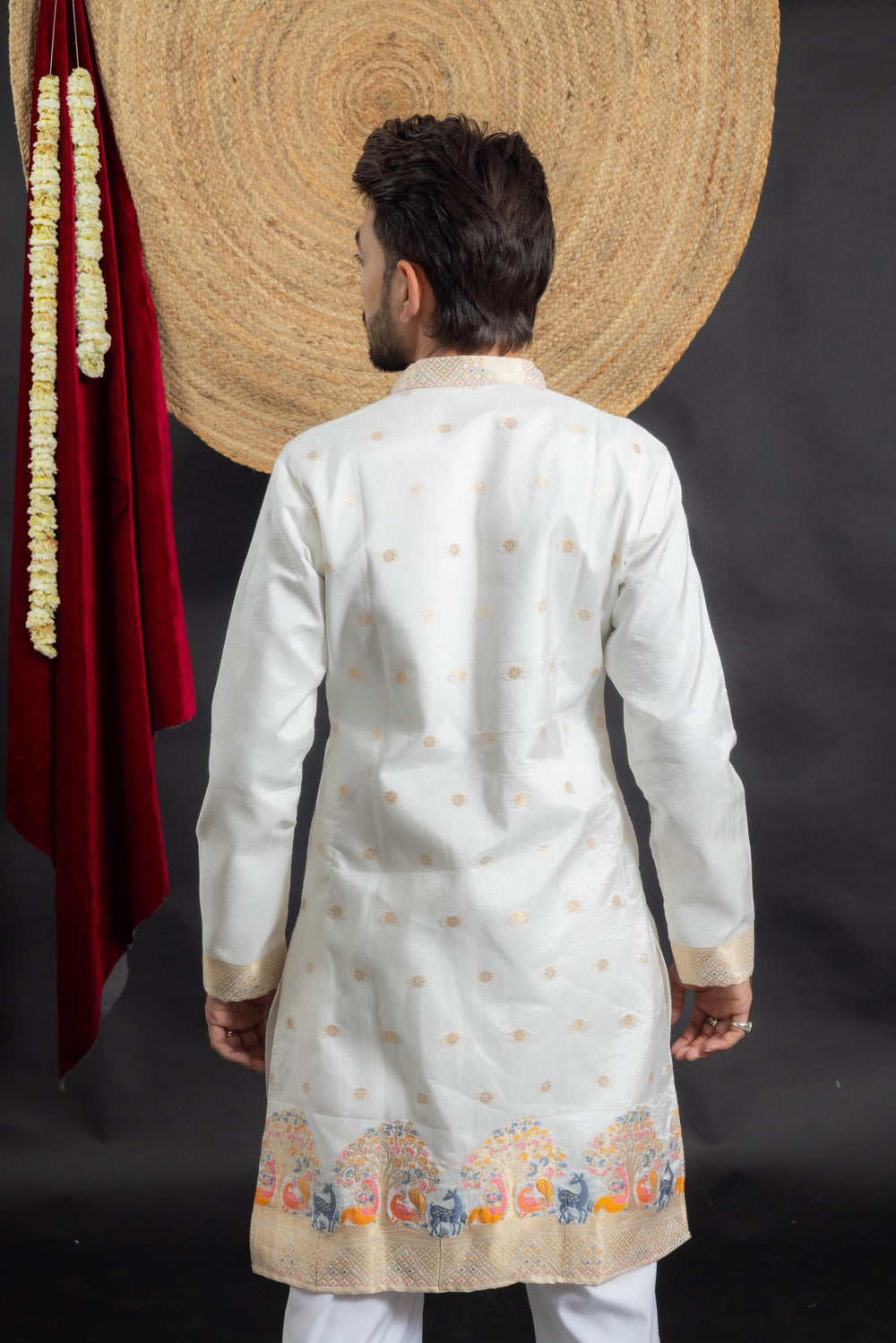 Elevate your festive wardrobe with this exquisite white Muslin cotton kurta, a masterpiece of traditional elegance. Adorned with subtle golden buti motifs and a grand handwoven border featuring royal animal and floral artwork, this kurta reflects heritage craftsmanship with a modern silhouette. The golden-thread Jacquard work cuffs and collar add a regal touch, making it the perfect choice for weddings, festive occasions, and cultural gatherings.
