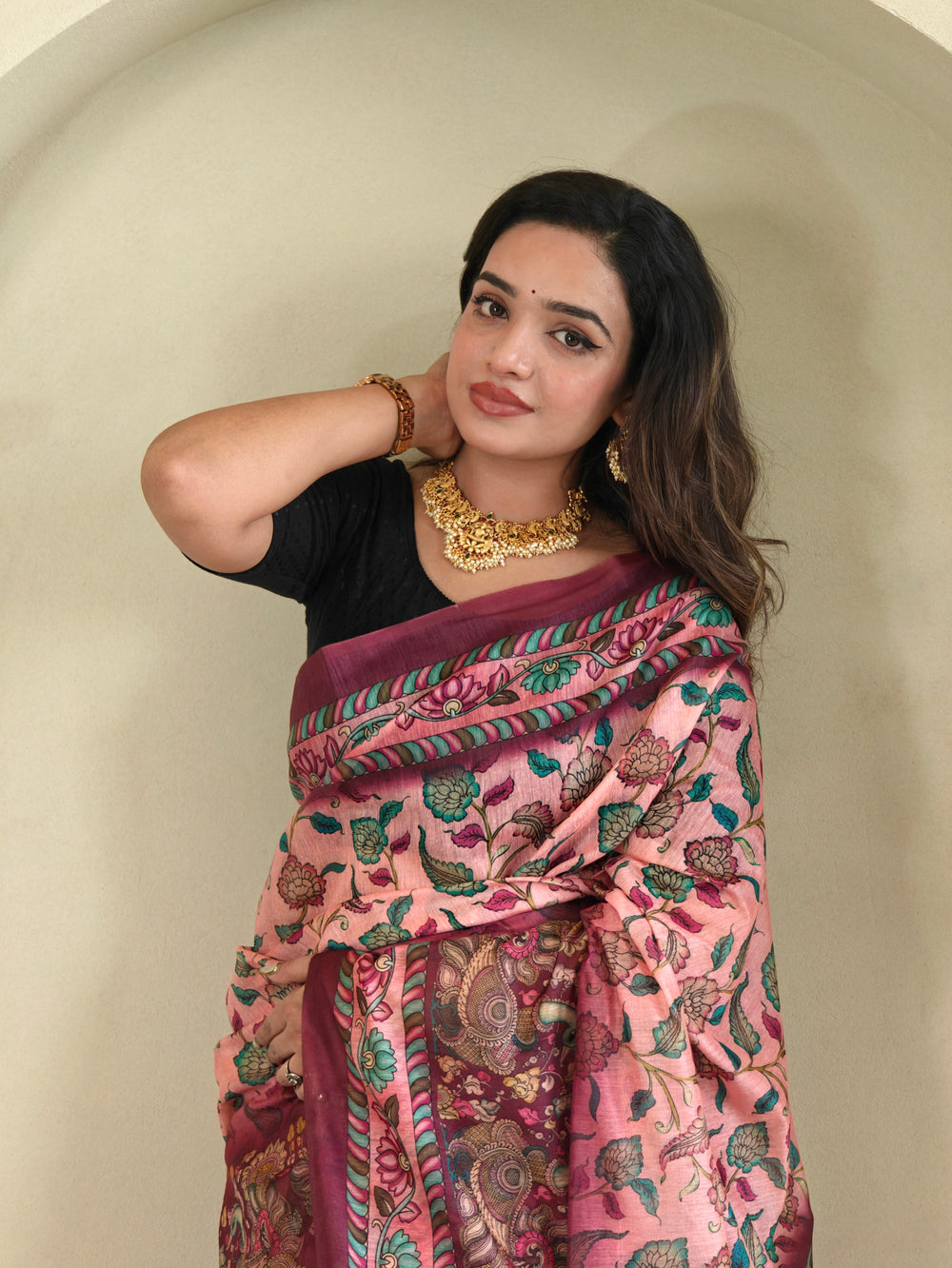 Pure malai Cotton Pink Kalamkari pattern Saree - Priyanka