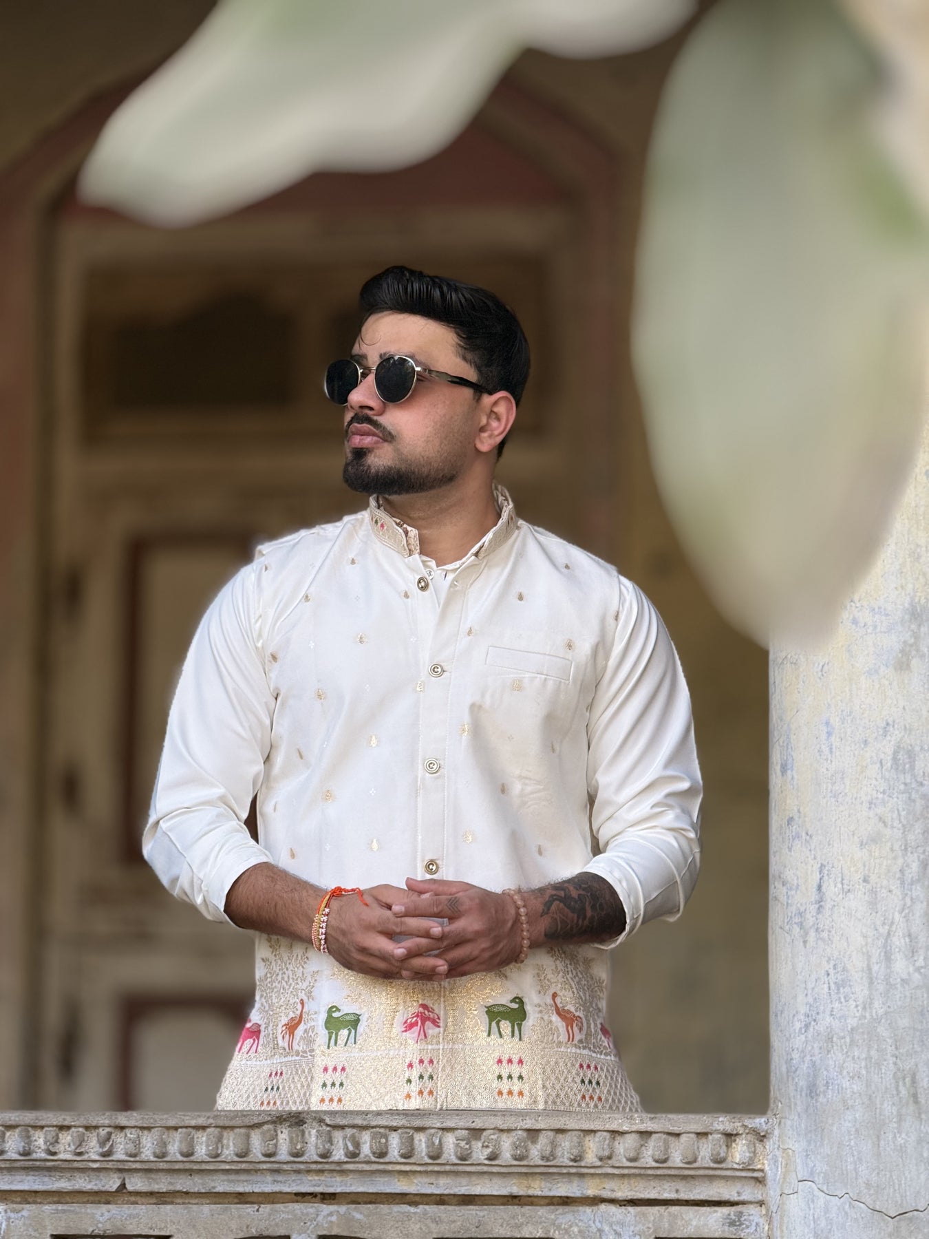 The masterpiece of this ensemble lies in the hemline, featuring an enchanting forest scene with deer and cranes. The vivid embroidery in shades of green, pink, and orange contrasts beautifully with the gold trees, bringing a lively yet sophisticated touch to the traditional silhouette.