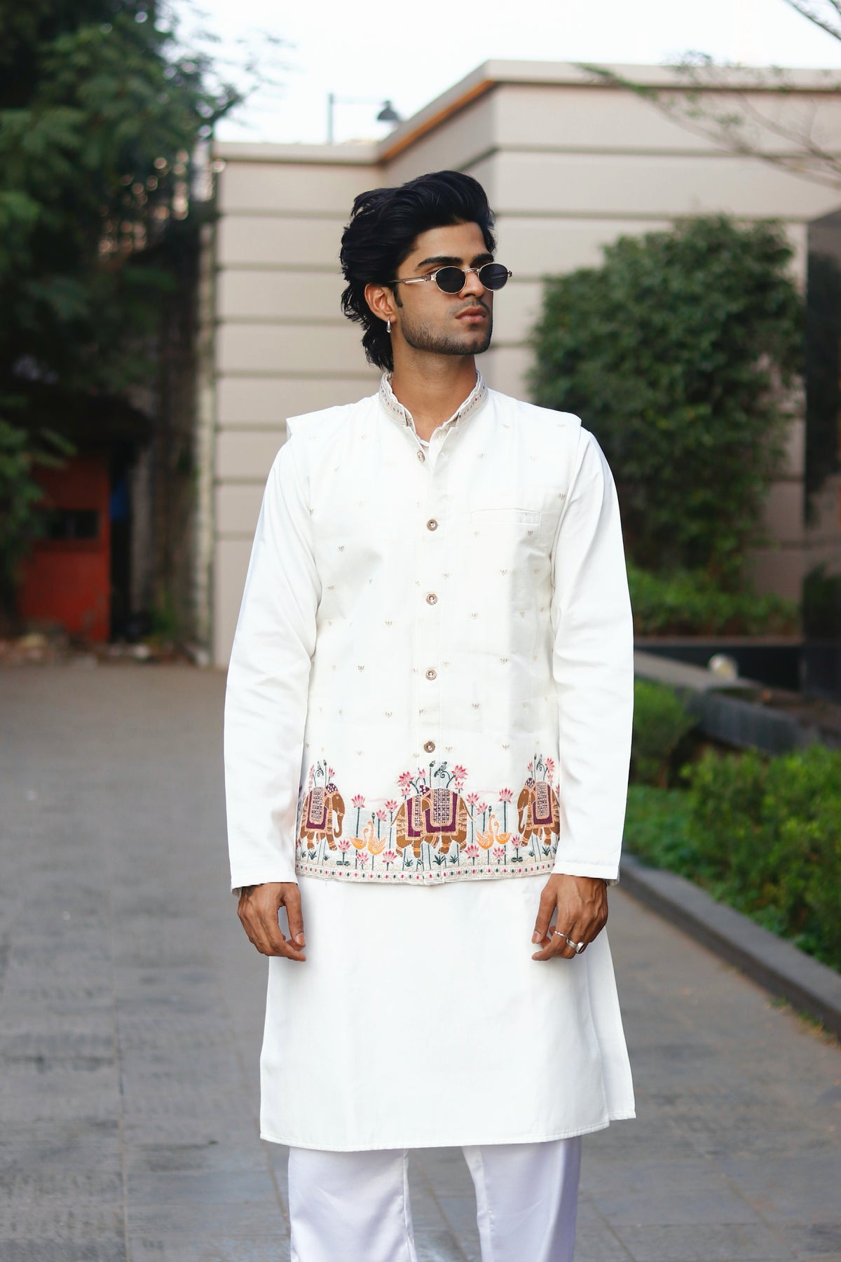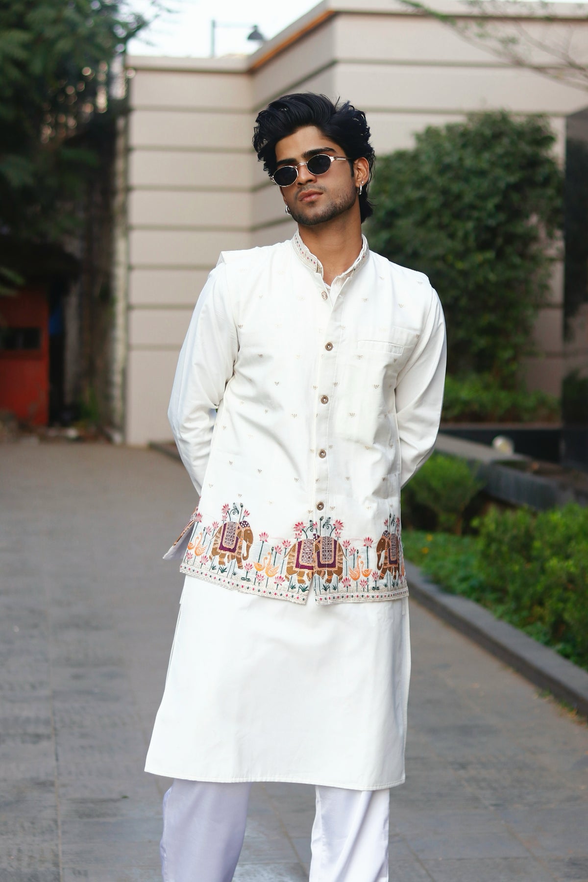 Step into a world of timeless royalty with the Rajkamal Gaj Koti Kurta Set, a true homage to the grandeur of Rajputana by SHRIIMANT. This two-piece ensemble blends heritage craftsmanship with regal aesthetics, layering a highly detailed Jacquard Koti over a premium ivory kurta to create a silhouette of unmatched class and charisma.