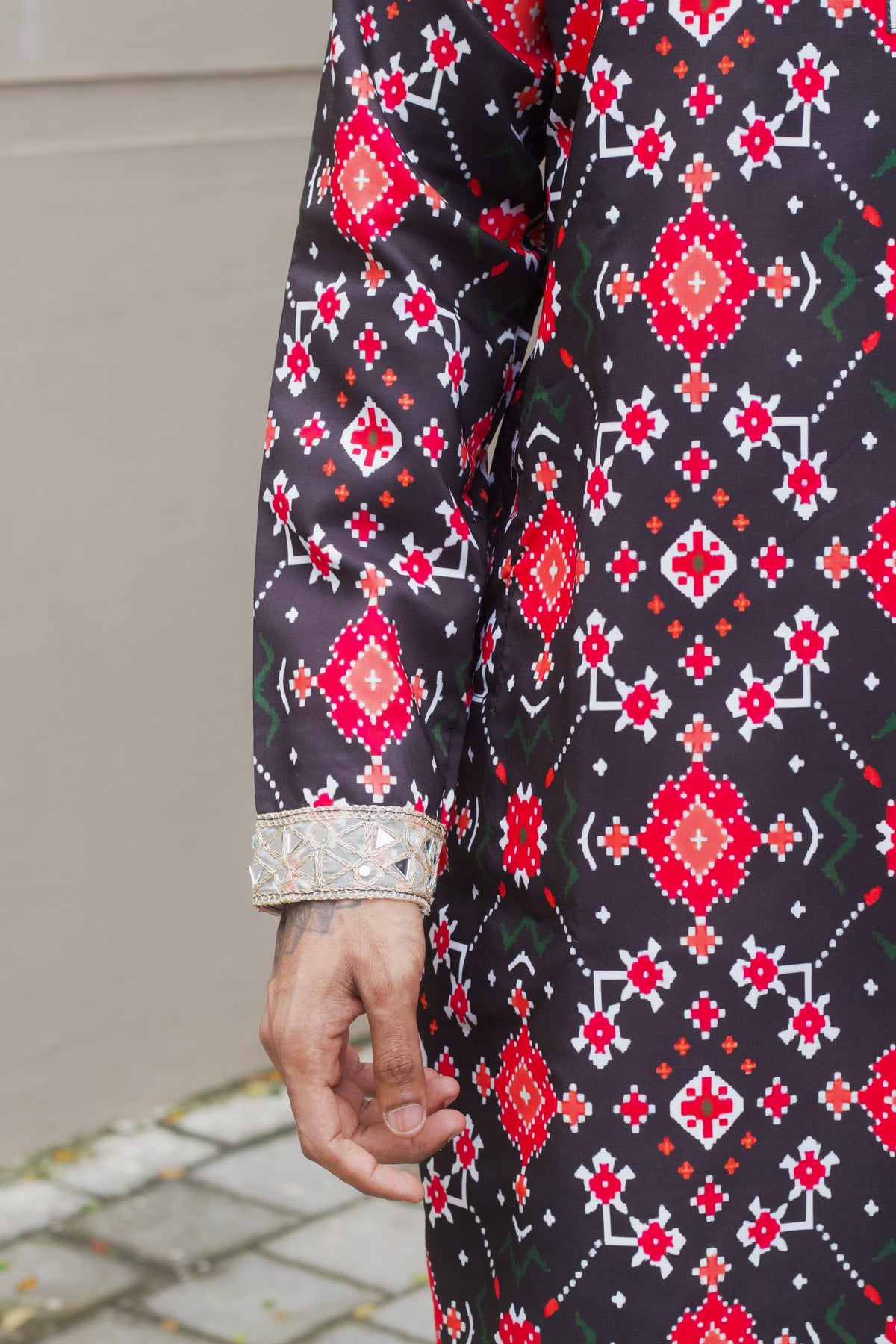 Set against a deep, midnight black canvas, the vibrant red and white geometric Ikat patterns create a mesmerizing contrast that commands attention. The sharp, diamond-shaped motifs are a nod to ancient weaving traditions, while the handcrafted mirror-work detailing on the collar, cuffs, and hem adds a layer of festive sparkle, making it perfect for celebratory nights.